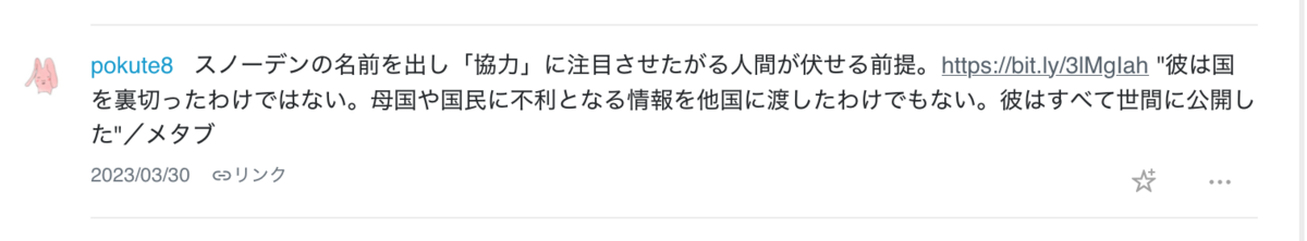 このコメントのリンク先は、なんと「オリバー・ストーン オン プーチン」の中でプーチンがスノーデンについて語っている発言 (を、ロシアのプロパガンダアカウントが言っているツイート)。そうね。プーチンが「スノーデンからは何も情報を得ていない」と言っているんだから、山形のこの記事は「協力」とかいってスノーデンにミソをつけようという悪質なデマ記事なんですね!!